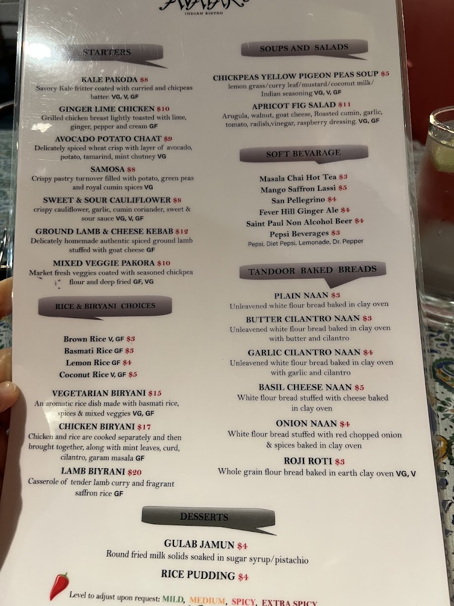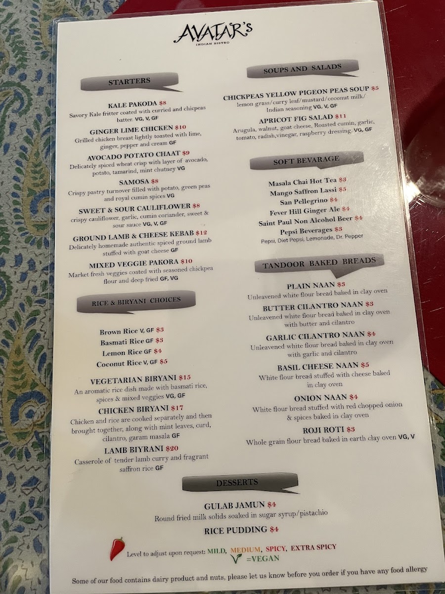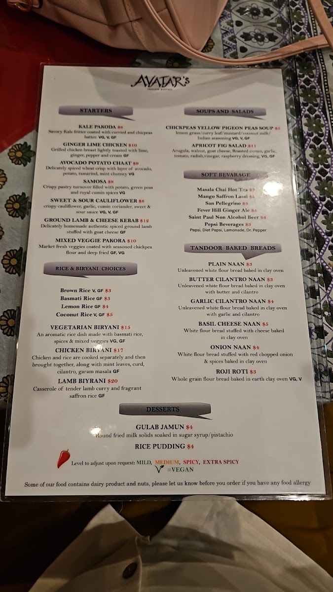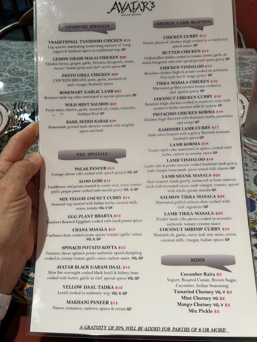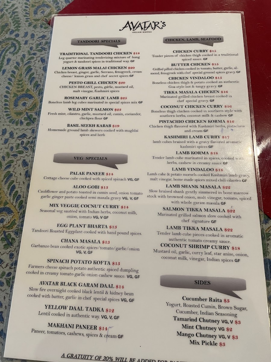 The menu at Avatar’s Indian Bistro offers a well-rounded selection of classic Indian dishes that balance comfort and bold flavor, making it a satisfying experience from start to finish. The vegetarian options are especially memorable, with the Chana Masala delivering rich, spiced chickpeas, while Aloo Gobhi and Palak Paneer provide hearty, flavorful plant-based choices that feel both traditional and comforting. Among the house favorites, the Chicken Tikka Masala stands out for its creamy tomato sauce and tender chicken, while the Traditional Tandoori Chicken brings smoky, charred flavors straight from the tandoor. The bread selection, including Garlic Naan, Onion Naan, and Rozi Roti, pairs perfectly with the curries and adds warmth and texture to the meal. To round out the experience, the Daal Tadka & Veg Biriyani combination offers both comforting lentils and aromatic rice, and finishing with a cup of Masala Hot Tea provides a soothing, spiced conclusion that ties the entire meal together nicely.